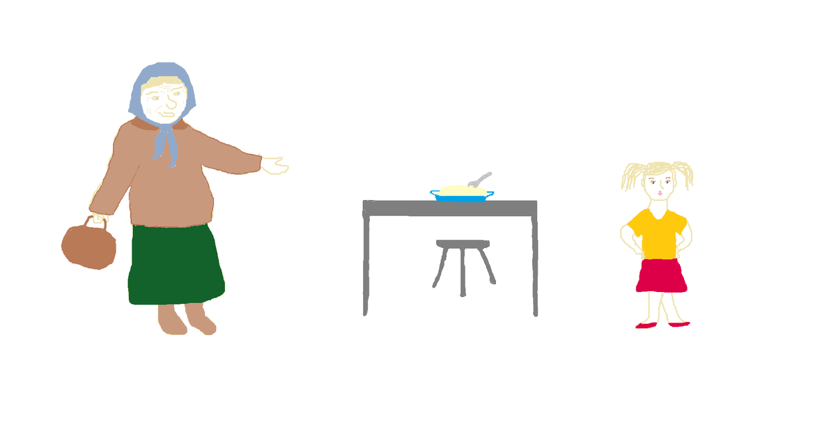 Утром папа и мама ушли на работу, а бабушка сварила для Наташи манную кашу и зовёт её завтракать: — Наташенька, каша готова, пойдём кушать. — Фу, опять каша. Не хочу. — Я тебе манную кашку сварила. — Не хочу манную! — Может, гречневую сварить? — Не хочу гречневую! — Может, рисовую или пшённую! — Не хочу! — Поешь, Наташенька, кашка манная, на молоке, с вареньем, вку-усная! — Варенье буду, а кашу не буду. — Не капризничай, внученька. Я сейчас в магазин пойду, а ты кашу ешь, а то не вырастешь. Ушла бабушка, а Наташа села прямо на стол, ноги свесила и говорит: «А я не хочу расти, хочу быть маленькой!» Только она это сказала, как стала уменьшаться. И вот Наташа уже размером с муху. А тарелка каши огромная, как озеро. Вдруг слышит: «Ж-ж-ж!» Это муха прилетела. Посмотрела она на Наташу, потёрла лапками, обрадовалась: «Хе-хе, какая ты маленькая! Я вот сейчас поем каши-малаши, и вырасту, и тебя, Наташа, с собой заберу, к своим детям унесу». Подползла муха к каше и давай её есть. Ест и раст