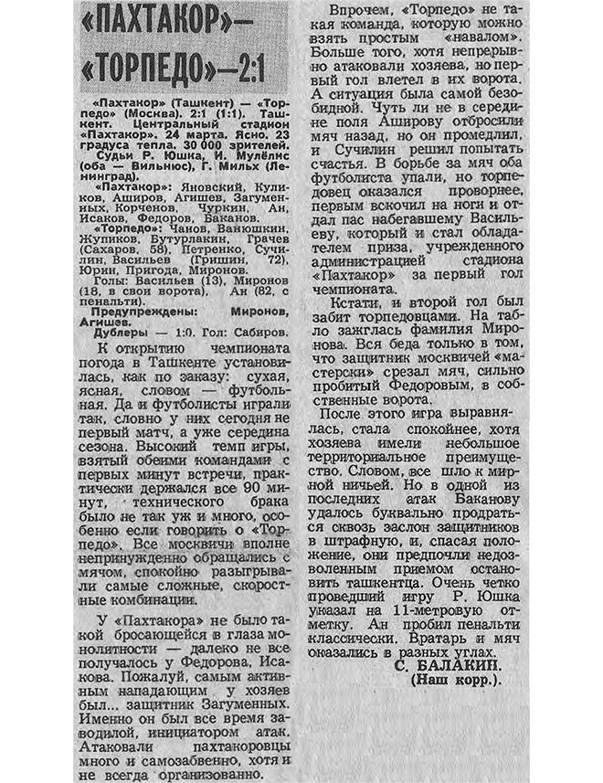 «Пахтакор» (Ташкент) - «Торпедо» - 2:1 (1:1)