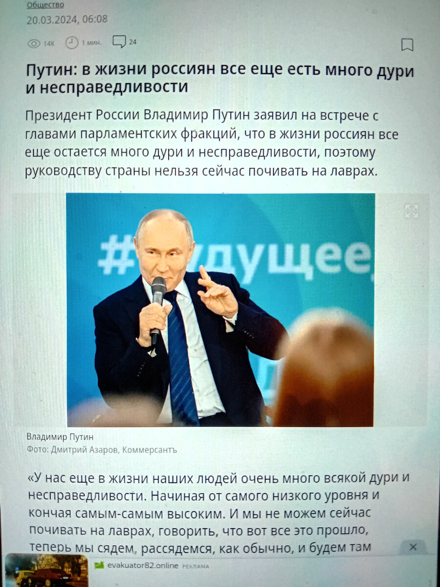 Мне тут попались на глаза слова победителя президентских выборов,сказанные им о дорогих россиянах и их жизни. Я даже удивлён как это они прошли мимо меня. Слова то есть. Ну, нельзя объять необъятное. А слова,действительно,интересные. И звучат как-то странно. Вроде как дурные мы с вами получаемся по мнению высшего руководства. Вам не обидно? Нет? И правильно. Ему из высоких сфер виднее. Одно непонятно. Если в нашей жизни и в наших головах столько дури,то что же он в который раз нами руководить рвется? Может перевоспитать хочет,умнее сделать? Желание похвальное,только вот для его реализации у него и так больше 20 лет было. Мало? Да,видать много,много в нас дури. Не повезло ему с народом, одназначно. Можно бы было даже посочувствовать победителю выборов по этому поводу, если бы не один нюанс. Он ведь там ещё и про несправедливости в жизни сказал. А несправедливости в жизни людей происходят в основном тогда,когда плохо работают или же не работают вовсе нормативные акты и законы.