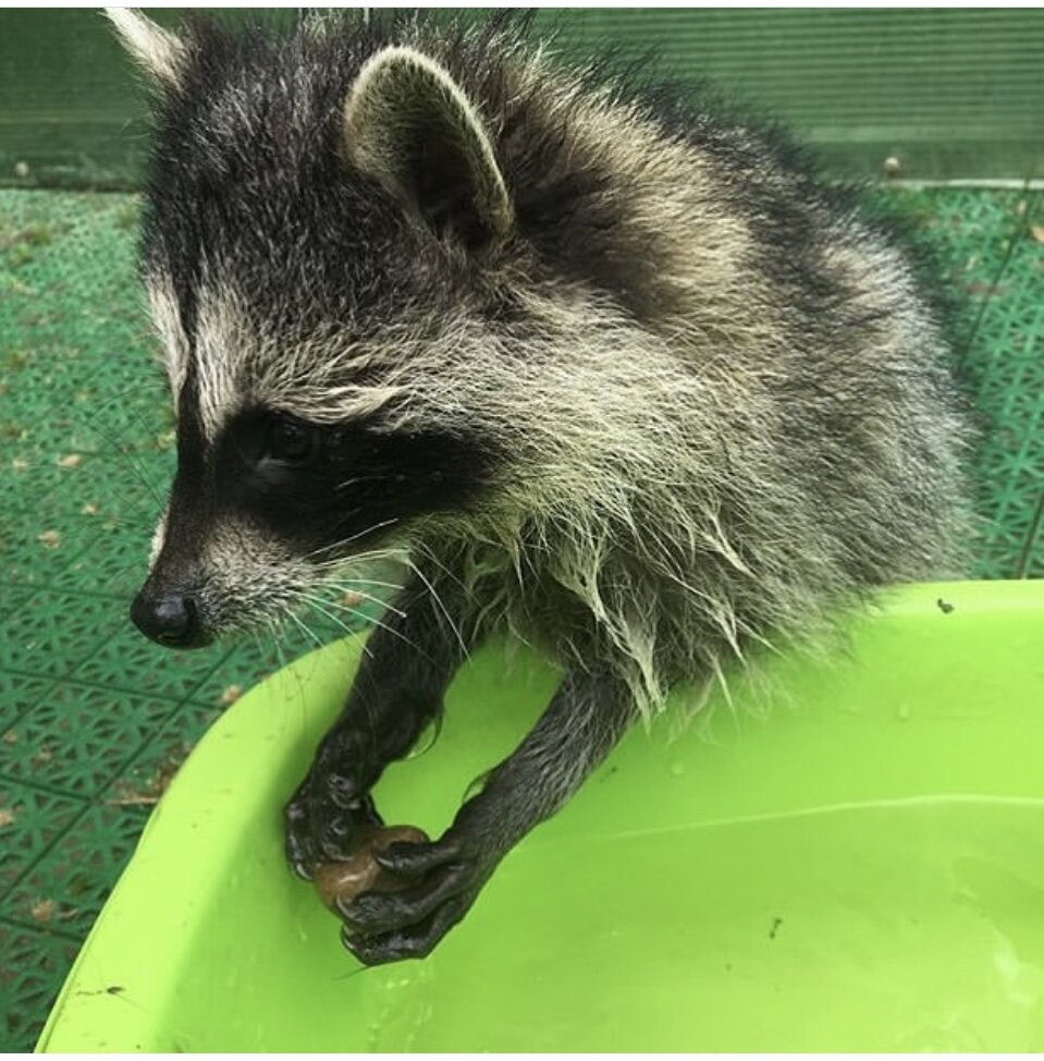 О! Такое еноты пропустить не могли! И вот уже все малыши, полностью забыв про страхи, ринулись к любимой водичке, на ходу устраивая стычки за первенство обладания источником. Разыгравшись, они и не заметили, как напор воды становился все сильнее, а шланг начал извиваться словно змея. Это только ещё больше развеселило маленьких озорников. Протискиваясь сквозь мокрые шубки, я пару раз получила по руке острыми зубками за попытку поиграть вне очереди. Но всё-таки, под всеобщее возмущение, забрала шланг и направила струю на пол, смывать кашу. И тут же возмущение сменилось новыми восторгами! Как весело ловить струйку воды в воздухе лапками! А прыгать в лужу, куда бьет струя! А наперегонки подставлять бок под воду, одновременно отталкивая другого енота! И игрушки сами по себе оживают от удара струи к великой радости маленьких озорников.