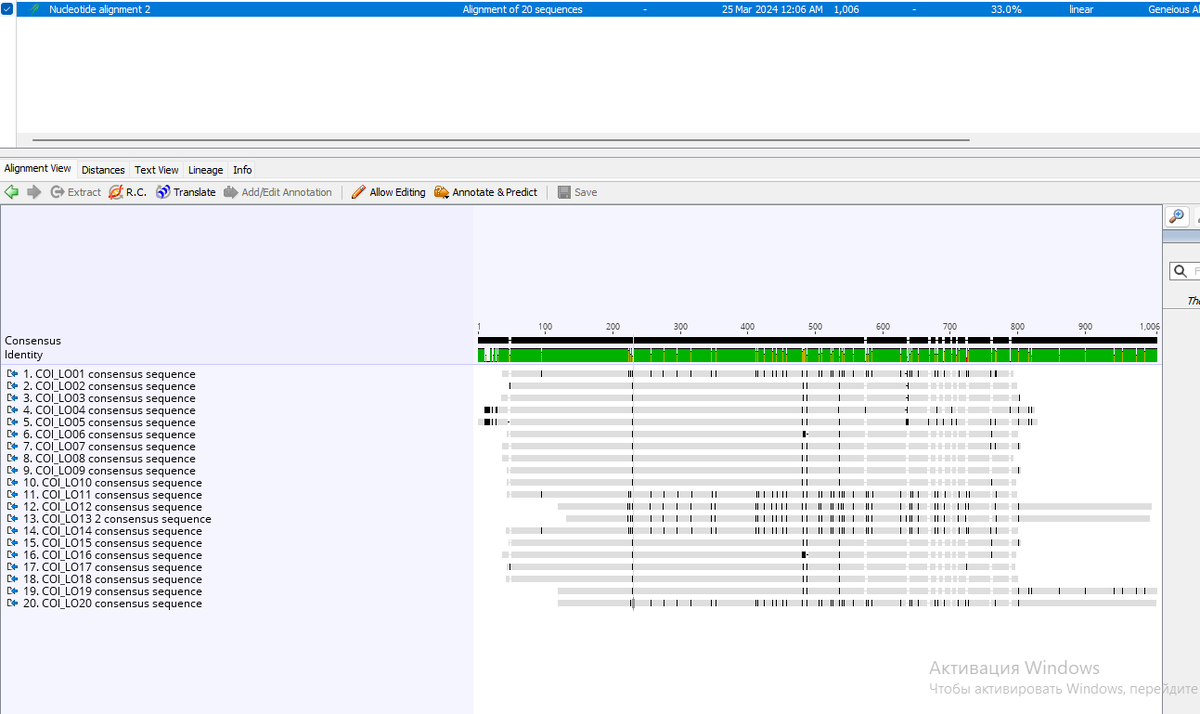 Для этой статьи я сделала выравнивание из 20 последовательностей. Как делать выравнивания в Geneious я написала в предыдущей статье. Это все один маркер, цитохром оксидаза с субъединица 1, баркодинговый регион. Это все представители одного рода, очень близкие виды. При таком увеличении черным обозначены позиции, где нуклеотиды отличаются. Надо ли что-то с этим делать? На самом деле в зависимости от ваших целей выравнивание можно редактировать по-разному. Давайте посмотрим на выравнивание поближе. Для того, чтобы его приблизить, надо нажать на значок лупы с плюсом. Если нажать один раз, то видим такую картину. Мы уже не можем охватить все позиции одним взглядом, но зато черные места стали по большей части цветными. Цветом обозначаются те места, где есть отличия в нуклеотидах. Если половина последовательностей имеет в конкретной позиции один и тот же нуклеотид, то этот нуклеотид в этой последовательности обозначается серым. Все отличия - цветом. Красный - аденин, синий - цитозин, зел