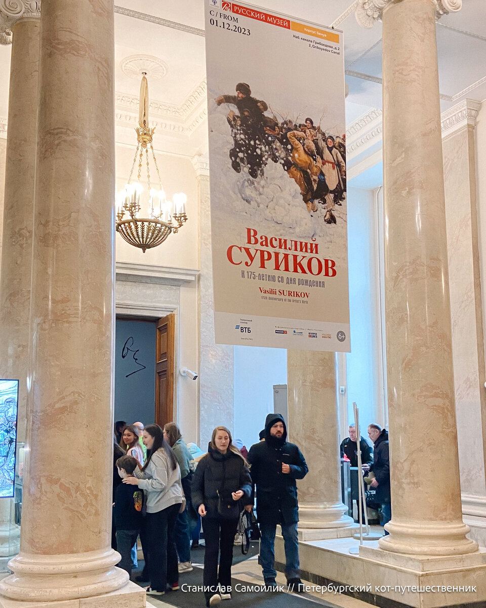 Сходил на выставку в корпус Бенуа Русского музея, на выставку Василия Сурикова. Тот редкий случай, когда работы из Третьяковской галереи, Красноярского музея и Русского музея собрали в едином пространстве. Билет на выставку стоит 700 рублей, что, по-моему, многовато, учитывая стоимость посещения того же Эрмитажа или всей коллекции Русского музея. И, несмотря на то, что работы здесь уже довольно долго и скоро закрытие, посетителей было очень много! Сразу на входе представлено длинное полотно с биографией и знаковыми событиями в жизни художника, довольно удобно и информативно все расписано. Конечно же, здесь весь масштаб встречает сразу, работа "Степан Разин". Меня всегда поражают такие громадные работы, а у Сурикова их довольно много, и все исполнены просто невероятно! Интересно было проследить за творческим путем и находками, за тем, что мастер искал себя в различных жанрах, но всегда сохранял свой почерк. Композиция всех работ - это, конечно, отдельная история! Суриков - гений композ