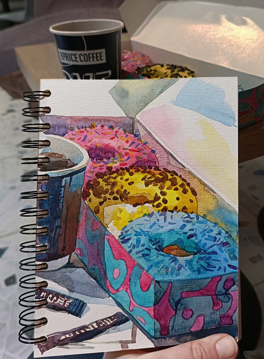 Акварель- отличный материал для скетчей и пленэрных вылазок. С прошлого лета я с удовольствием хожу на пленэры, а когда погода не позволяет- делаю зарисовки с натуры, в основном это скетчи с едой, потому что еда- идеальный объект для быстрых зарисовок: ярко, выразительно, а главное- можно обойтись без сложного рисунка и анатомии. Рисование с натуры- отдельное удовольствие, которое никак не сравнить с рисованием по фотографиям... Да еще и отличная тренировка композиционного мышления, цветового чутья... в общем сплошные плюсы. И просто очень приятно бывает посидеть в тихой кофейне, порисовать немного, а потом с удовольствием съесть свой прекрасный "натюрморт". С "фуд-скетчингом" (а по-нашему просто "зарисовками еды") с натуры легко справляются не только опытные художники, но и новички, а главное- не нужна куча дорогих материалов: даже минимальным и самым недорогим набором акварели можно сделать очень приличную и живую зарисовку. Я намеренно проводила небольшой эксперимент и пробова