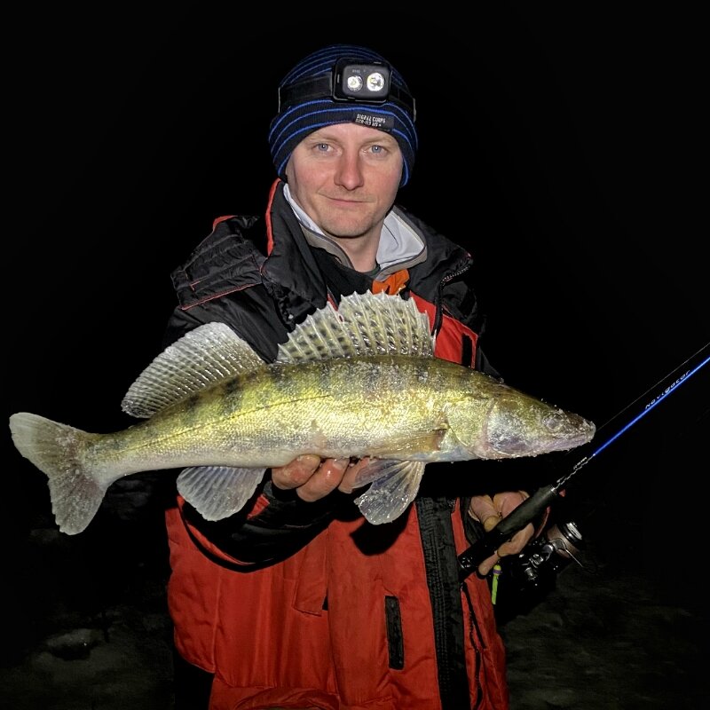 Весна постепенно вступает в свои права. Прибрежный лёд становится опасным, местами на нем появились промоины. Передвижение по нему — как по минному полю. Но очень уж хотелось проверить активность судака ночью. Ведь несколькими днями ранее я неплохо отловился посветлу. Пробежавшись по интересным точкам, поклёвок не увидел. Оставалось только работать по площадям и заново искать рыбу. Такая тактика принесла результат. Первая поклевка произошла на небольшую мандулу. Судак прихватил её за задний тройник и был с лёгкостью вытащен. А вот со вторым пришлось повозиться. Хоть он и был поменьше размером, у самой кромки начал отчаянно сопротивляться и загнал тройник в лёд. После десяти минут танцев с бубном он всё же был доставлен на фотосессию. Чуть позже была еще одна поклевка. На этот раз клыкастый позарился на резину. Но доставить его на берег не удалось, произошёл обидный сход. А соперник-то явно был самым крупным на этой рыбалке. Жаль, конечно, ну да ладно. Эмоции от вываживания получены. Да