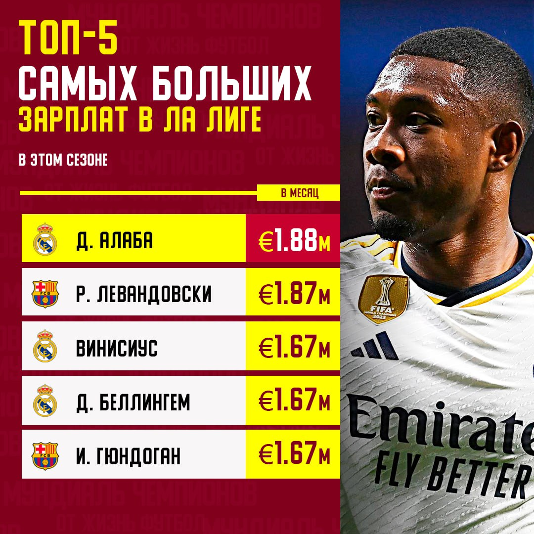 🔝💵 Давид Алаба – самый высокооплачиваемый игрок Ла Лиги с зарплатой 1,88 млн евро в месяц🤑 Бывшие игроки «Баварии» и «Боруссии» хорошо устроились в Испании