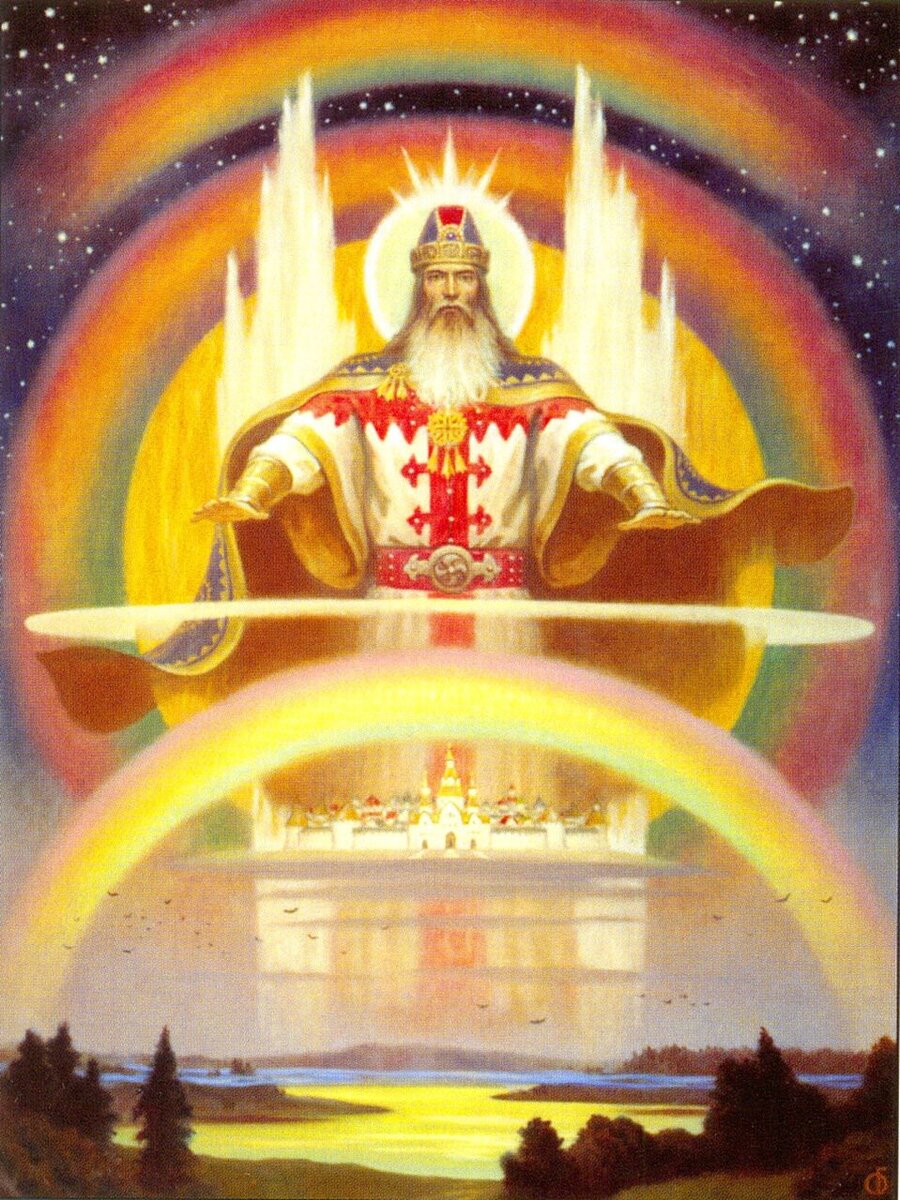 Сварог – Бог Небес Явного Мира, покровитель Вырия – райского сада славяно-ариев, небесного града Богов Асгарда и Чертога Медведя во Сварожьем Круге (славянский аналог зодиакального гороскопа, древнерусский календарь; он же Каляды Дар; он же Круголет Числобога). Сварог – Сва (свет) + ро (рождающий) + га (движение) = приводящий в движение самосветящиеся частицы; или порождающий жизнь.