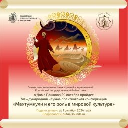Уважаемые деятели науки, культуры и искусства, преподаватели вузов, средних специальных образовательных учреждений, докторанты, аспиранты, магистранты и студенты! Приглашаем Вас принять участие в Международной научно-практической конференции «МАХТУМКУЛИ И ЕГО РОЛЬ В МИРОВОЙ КУЛЬТУРЕ», ПОСВЯЩЁННОЙ 300-ЛЕТИЮ СО ДНЯ РОЖДЕНИЯ ВЕЛИКОГО ТУРКМЕНСКОГО ПОЭТА, ФИЛОСОФА МАХТУМКУЛИ ФРАГИ, которая будет проходить на VIII Московском Международном фестивале искусств «Звуки Дутара» им. Нуры Халмамедова.
