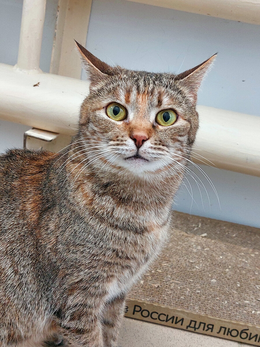 Аппетитная булочка, поджаристый бочок, симпатичный колобок … Все эти сравнения относятся к некой мадемуазель по имени Гренка. Это молодая кошечка с удивительными способностями организатора мероприятий. И я абсолютно не лукавя, скажу, что это именно так. Может в прошлой жизни она была выпускницей режиссерского факультета или работала массовиком затейником где нибудь в парке, но в нашем приюте Гренку знают все. Спокойная, немного пугливая полосатая шпротинка кошка умеет объединить и организовать всех. Гренка придумывает разные ситуации и помогает влюбленным кошечкам или не дает скучать пожилым котам, разрабатывая план действий на долгие зимние вечера. Она и игры придумает и конкурсы интересные. Наша Гренка еще и модница неплохая. Попросила свою подругу мазнуть кисточкой с рыжей краской по бокам, да по носу. И получилась кошка такой поджаристой, золотистой греночкой. Зеленые глаза Гренки изумительно подходят под ее образ золотистой красотки. Иногда грустит наша кошка, что не реализуется н