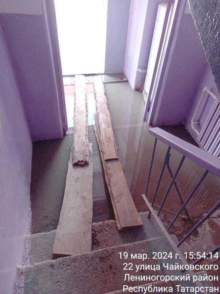 Фотографии, на которых запечатлены длинные доски, уложенные на землю от входа в подъезд до лестничного пролета, просочились в социальные сети. Спросите, для чего это нужно? Всё просто. Талая вода просочилась в подъезд дома № 22 по улице Чайковского и, чтобы пройти до ступеней, не промочив при этом ног, невозможно. На несколько сантиметров грязная вода уже несколько дней заполняет пол в подъезде и нисколько не радует жильцов, которые, балансируя на прогибающихся под тяжестью тела досках, пытаются удержать вертикальное положение. «А как же быть мамочкам с колясками и детьми, да еще с сумками с продуктами в руках? А как быть старикам, которым и по ровной поверхности ходить сложно?», - задаются жильцы вопросами и спрашивают: «До каких пор будет длиться это безобразие, куда смотрят жилищники?». Фото: предоставлено подписчиками соцсетей.