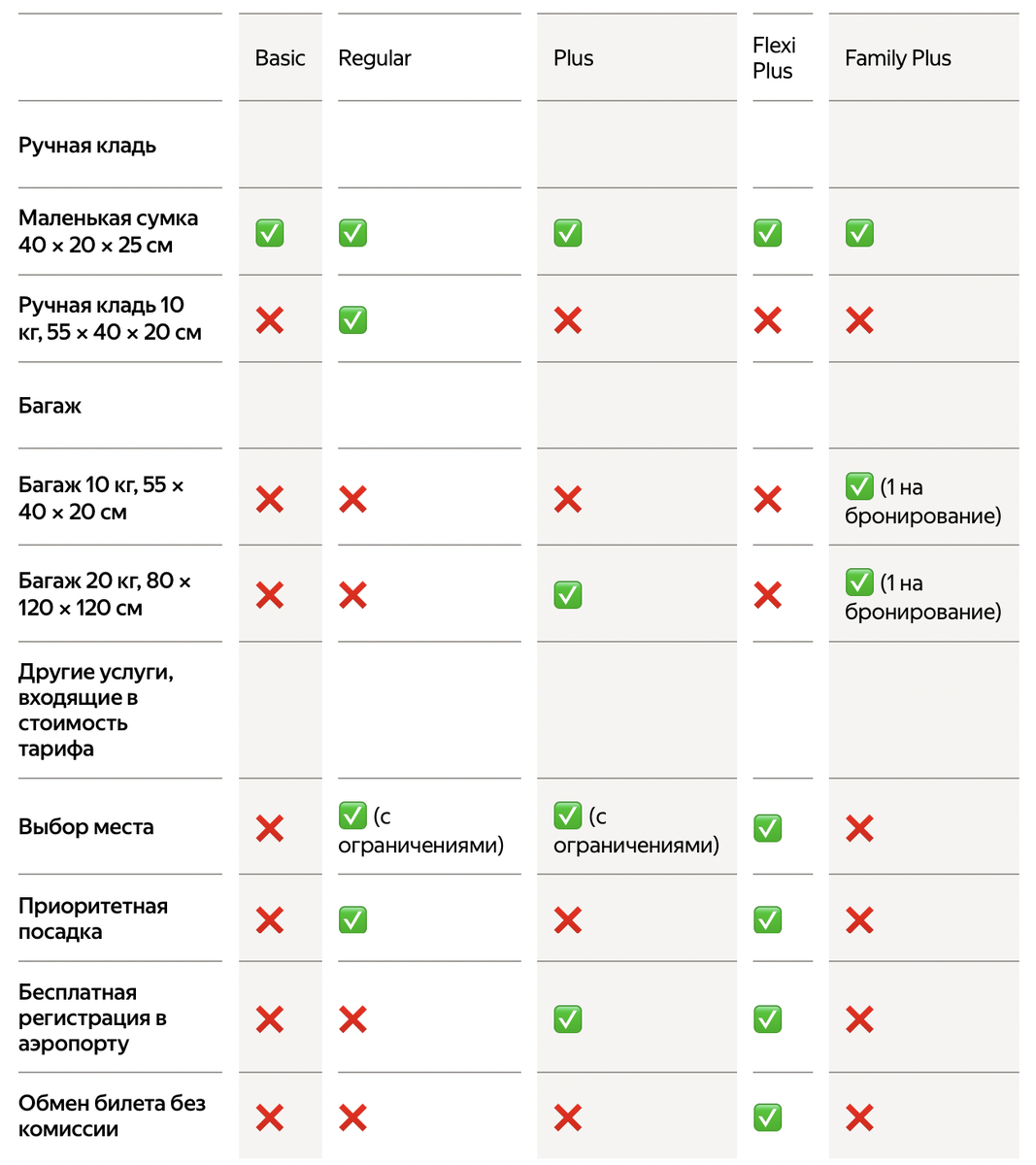 Ryanair продаёт авиабилеты по пяти тарифам: Basic, Regular, Plus, Flexi Plus и Family Plus. Подробнее условия расписала в таблице. Фиксированной доплаты за тариф подроже нет, стоимость билетов зависит от выбранного рейса.