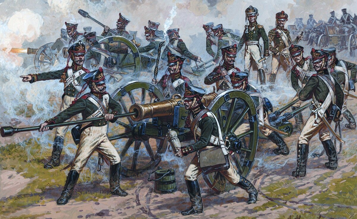 Например, в фильме "Союз спасения" показано действие картечи на строй солдат. Хочу отметить, что нужно было обладать действительно выдающимся мужеством, что б идти плотными рядами на артиллерийскую батарею, которая раз в 30-40 секунд косит строй. Но вернемся к организации русской артиллерии. За каждой пушкой был закреплен расчёт под командой унтер-офицера – фейерверкера. Туда обычно входило 5-6 человек: бомбардиры (опытные рядовые с повышенной квалификацией) и канониры, гандлангеры (рядовые, для вспомогательных действий). У каждого был свой номер при пушке: №1 действовал банником, №2 носил зарядную суму, №3 имел пальник и свечник, №4 – трубочную лядунку и протравники, и т.д. Перед стрельбой, по команде «Становись по своим местам!» нечётные номера строились по правую сторону орудия, а чётные – по левую. Два орудия с прислугой составляли взвод под командованием обер-офицера.