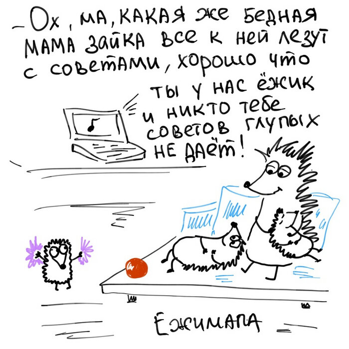Вчера младший сын самовольно перенёс свой дневной сон на восемь вечера и к десяти был бодр, весел и хотел танцевать и петь, а старшие дети в это время уже ложаться спать, конечно я предлагала ему передумать, пела песенки осипшим голосом, рассказывала сказки, шипела как змея, но сын был непреклонен, он требовал игр. В такой ситуации когда я уже всё, старшие дети не хотят уходить спать, а младший скачет, лучшее решение это аудиосказки, включаем, валяемся все вместе и слушаем. Вот вчера нам попалась сказка Шеридан Кейн ^Куда уложить зайчонка ^. Даже мальчишки сочувстврвали бедной маме зайке, которой все давали ^умные советы ^ куда укладывать спать своего зайчонка и удивлялись что их маме никто ничего не советует в отношении детей.Ну тут виноват весьма дурной характер их мамы)) Сталкиваетесь с советчиками? Или характер не позволяет? Пост автора egimapa. Комментарии