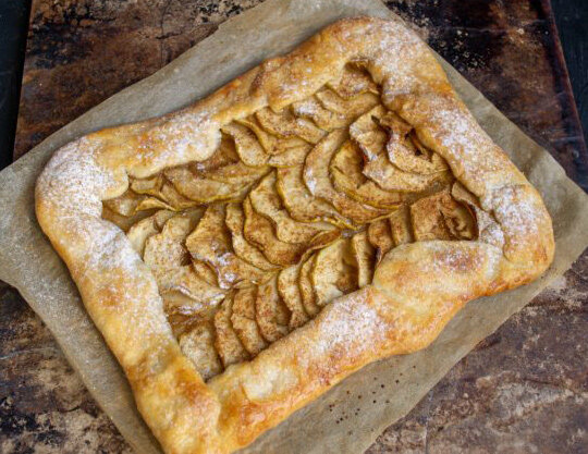 Для начинки: 2 крупных кисло-сладких яблока, 30 г сахарного песка, 1 ч. л. молотой корицы, половинка лимона, сахарная пудра для украшения. Замешиваем тесто Наливаем в миску ледяную воду, добавляем подсолнечное рафинированное дезодорированное масло. Добавляем к маслу и воде соль, взбиваем ингредиенты венчиком, пока не получится светлая эмульсия. Засыпаем пшеничную муку и ложкой перемешиваем тесто до тех пор, пока оно достаточно загустеет, затем выкладываем на посыпанную мукой доску и вымешиваем несколько минут. Готовое тесто укрываем плёнкой и оставляем на 20 минут при комнатной температуре.