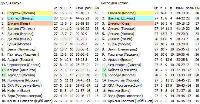 «Торпедо» - «Кайрат» (Алма-Ата) - 0:0 (у «Торпедо» это была сверхлимитная ничья, очко за которую оно не получило)