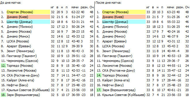 Игры предпоследнего, 33-го тура чемпионата страны по футболу, состоявшиеся в пятницу, не прояснили ситуацию ни в стане лидеров, ни среди группы команд, которые борются за то, чтобы удержаться в высшей лиге. Команды «Спартак» и «Динамо» (Киев), стоящие во главе турнирной таблицы, не записали в свой актив ни одного очка: спартаковцы сделали с одесским «Черноморцем» вторую сверхлимитную ничью - 1:1, а киевляне проиграли своим тбилисским одноклубникам – 0:1.
