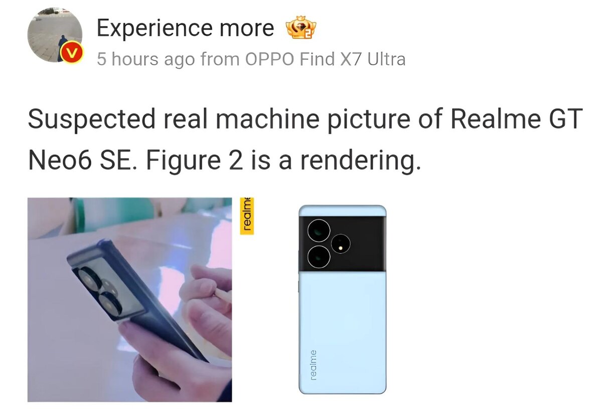 Компания Realme планирует расширить свою линейку устройств gt neo новой моделью - gt neo 6 se. Неделей ранее Realme поделилась некоторыми деталями о смартфоне, включая его схему. Теперь, благодаря изображению, просочившемуся на Weibo, можно увидеть настоящий вид gt neo 6 se и рендер устройства. Задняя панель смартфона имеет три круглых элемента (2 выступающих и 1 на уровне модуля камер), предположительно для трех камер и фонарика. Модуль камер располагается во всю ширину устройства, что отличается от предыдущей модели, хотя и gt neo 5 se имел значительно выступающий модуль камер. Однако точность этой информации может быть под вопросом и лучше отнестись к ней с определенной долей недоверия. При этом Realme уже официально подтвердила, что gt neo 6 se будет иметь новейший чипсет Snapdragon 7+ Gen 3. Это самый новый среднеклассовый процессор от Qualcomm, который обладает производительностью, сопоставимой с процессорами серии Snapdragon 8. Этот процессор оснащен основным ядром Cortex-X4 с т