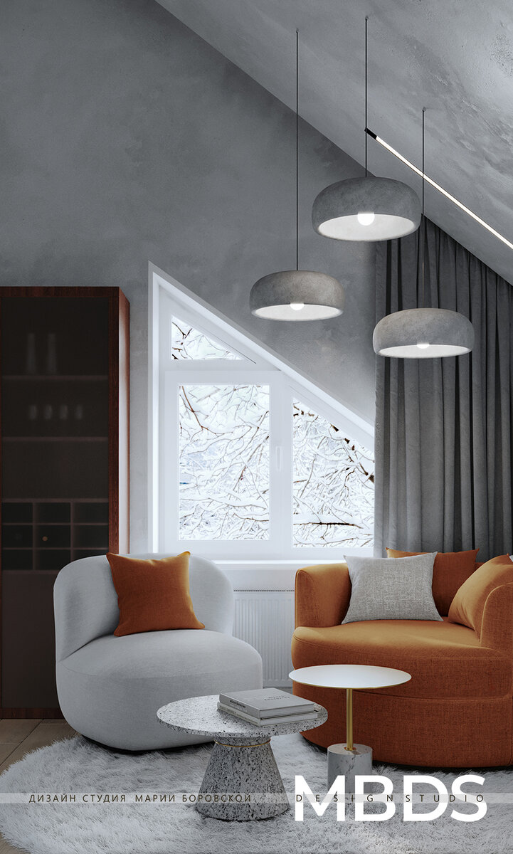 Мы смягчили острые углы мансарды с помощью узоров штукатурки в виде кругов. Это создает визуальный путь по космическим линиям и придает пространству уют.