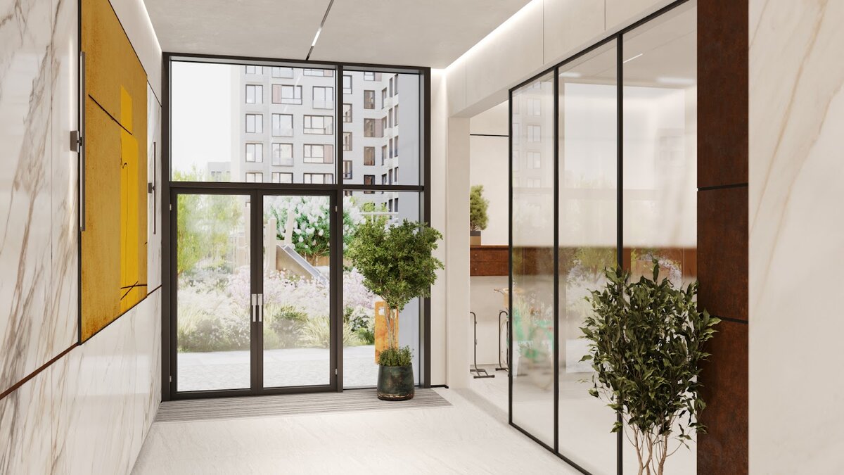 Для отделки используются природные долговечные материалы (например, мрамор), а металлические элементы выполнены из кортеновской стали. Обилие декоративного стекла позволяет создать пространство, наполненное светом и воздухом. Помимо этого в холлах установлена система дизайнерского освещения с акцентной подсветкой.