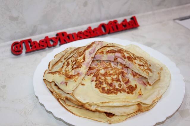 Ингредиенты: 2 ст молоко 1 ст Мука 1 ч.л сахар 0,5 ч.л соль Щепотка сода 1 шт яйцо 150 гр ветчина 150 гр сыр Способ приготовления Шаг 1 в чашу наливаем молоко, добавляем соль, сахар, яйцо и все перемешиваем. После добавляем муку, соду и перемешиваем. Потом налипаем подсолнечное масло и перемешиваем ещё раз. Даём тесту постоять в холодильнике минут 30. Шаг 2 нарезаем ветчину мелко и сыр трём на терке. Шаг 3 на горячую сковородку немного масла и сверху блинное тесто , сверху кладём сыр и ветчину и опять сверху начинки наливаем тесто. Жарим блин до готовности с двух сторон. Приятного аппетита 😘 #рецепты_светы 👉🏼 Больше видеорецептов смотрите на Ютуб канале