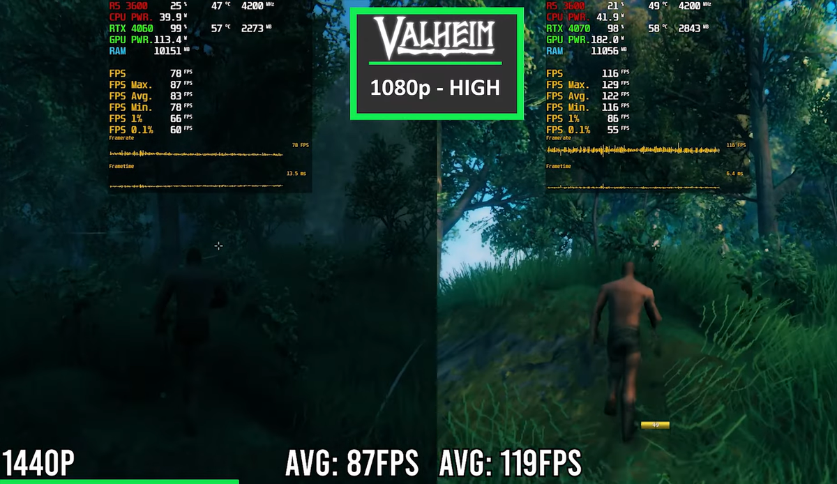 На YouTube-канале Hardware Tested в одном из выпусков протестировали RTX 4060 и 4070 в современных играх. В игре Red Dead Redemption 2 на настройках графики Epic в 1080p средняя производительность составляла 88 к/с (4060) и 120 к/с (4070). В 1440p эти же показатели равнялись 70 и 105 к/с соответственно. Rainbow Six Siege тестировалась с высоким пресетом в 1080p со средним FPS 326 (RTX 4060) и 330 (RTX 4070), в 1440p - с 276 и 317 к/с соответственно. Valheim запускалась с высокой графикой. В среднем в 1080p в этой игре частота кадров находилась на уровне 129 к/с (RTX 4060) и 166 к/с (RTX 4070), в 1440p - 87 к/с и 119 к/с соответственно. Игра The Witcher 3 шла с ультра-пресетом. Средняя производительность в ней равнялась 83 к/с (4060) и 132 к/с (4070), в разрешении 1440p - 61 и 81 к/с соответственно. В CS:GO 2 с высоким пресетом в Full HD средняя частота кадров составляла 239 (RTX 4060) и 265 (RTX 4070), в QHD - 184 и 263 к/с соответственно. Fortnite Chapter 5 S2 запускалась в 1080p и 14