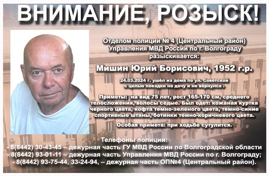 Волгоградские полицейские ищут без вести пропавшего 71-летнего Юрия Мишина. Ранее в отдел обратилась его дочь, которая сообщила, что отец вышел из дома по улице Советской в Центральном районе, чтобы поехать на дачу в поселок Сахарный.