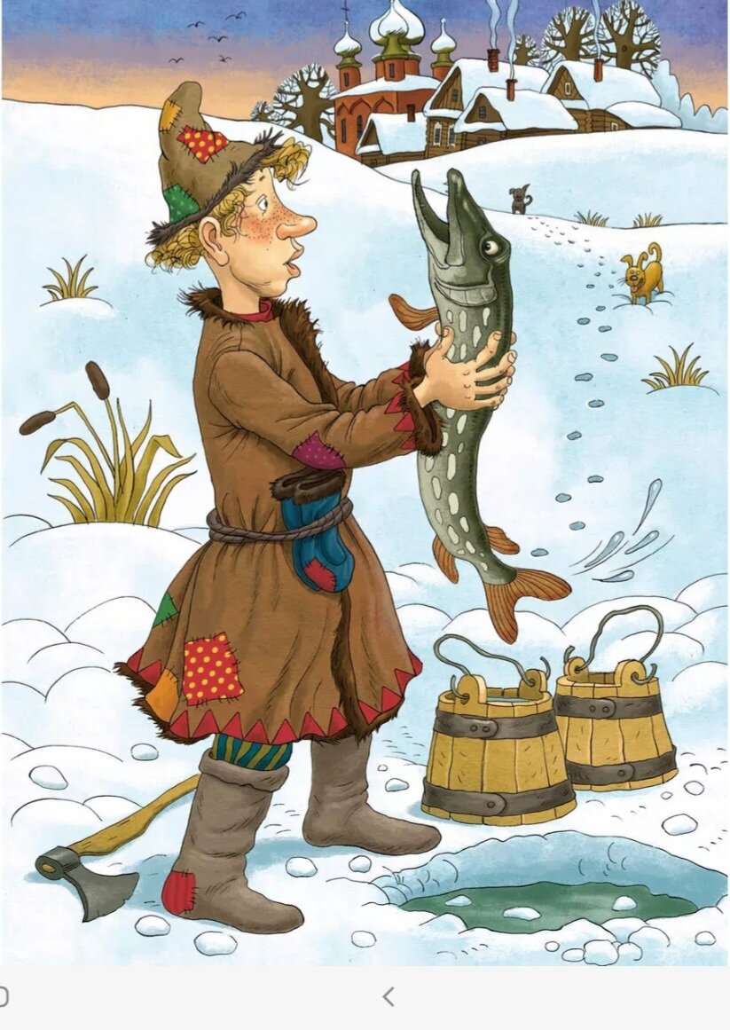 Прорубил лед, зачерпнул ведра и поставил их, а сам глядит в прорубь. И увидел Емеля в проруби щуку. Изловчился и ухватил щуку в руку:
