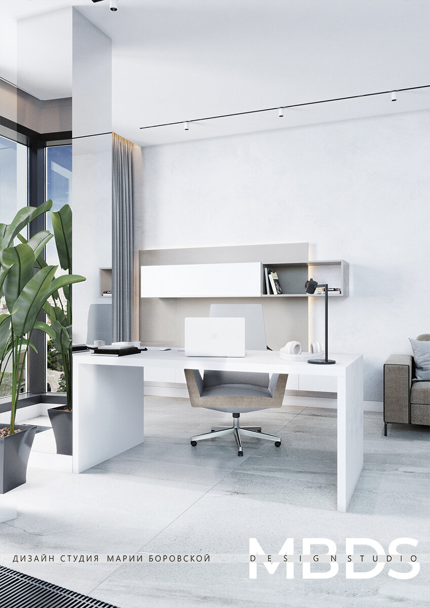 2. Кабинет лучше делать в базовых тонах и с минимальным декором. Так взгляд не будет цепляться и отвлекаться.