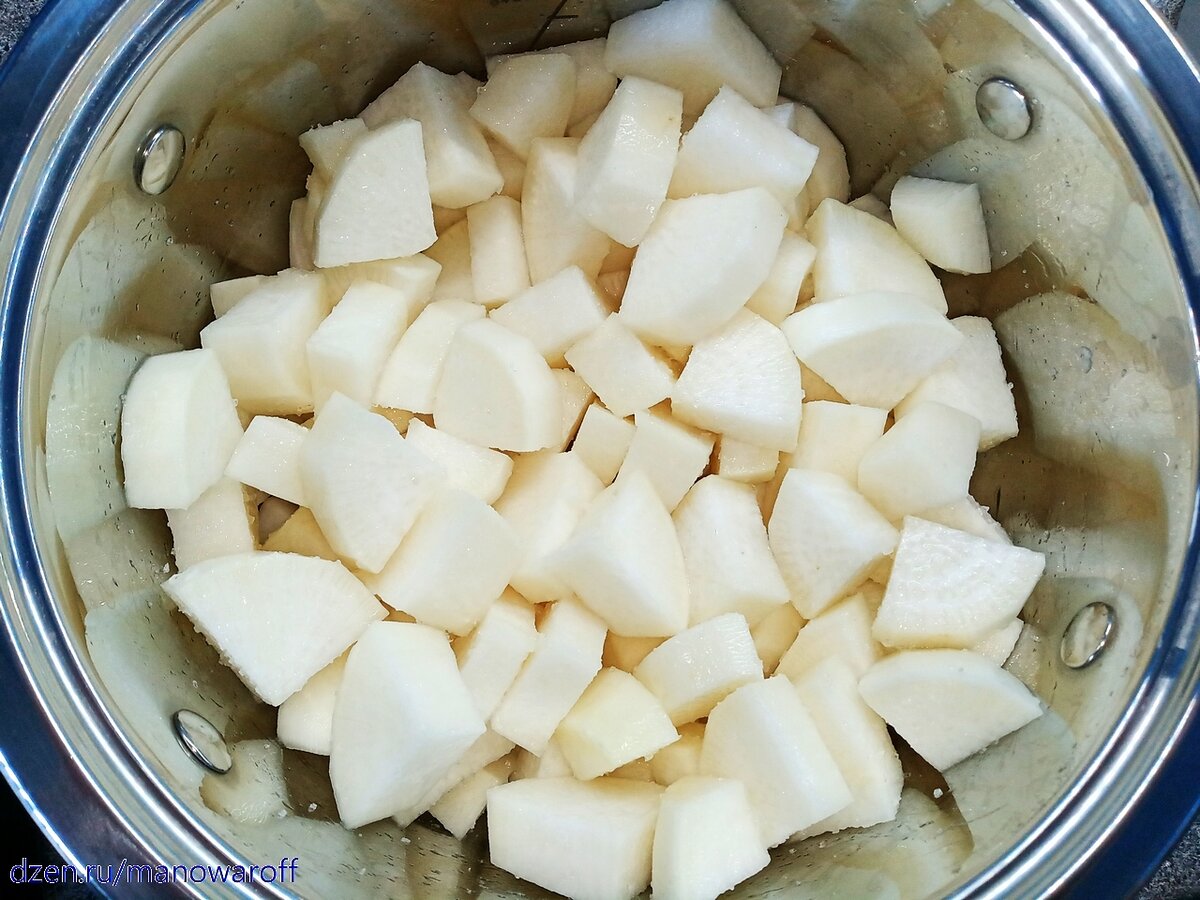 Сегодня будем готовить второе по популярности кимчи после кимчи из пекинской капусты. Готовится оно просто, быстро и без использования каких-то экзотических ингредиентов. Для приготовления нам потребуется: *Если нет рисовой муки, то можно использовать пшеничную. Дайкон чистим, разрезаем вдоль на четыре части и нарезаем поперек толщиной сантиметра в полтора. Кладем в кастрюлю, солим, хорошенько перемешиваем и оставляем на час. Пока дайкон просаливается, мы займемся заправкой - в 100 мл холодной воды разводим муку. В небольшую кастрюльку или ковшик наливаем 250 мл воды, ставим на плиту, доводим до кипения и заливаем туда растворенную муку. Снова доводим до кипения, огонь уменьшаем и готовим, постоянно размешивая венчиком, несколько минут до небольшого загустения. Снимаем с огня, добавляем кочукару, сахар и молотый имбирь. Хорошенько размешиваем и даем остыть. Когда заправка полностью остынет, добавляем в нее черный перец, рыбный соус и выдавливаем на прессе чеснок. Все еще раз хорошенько