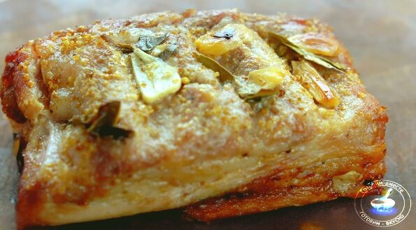 "Ароматное сало с лавровым листом (запеченное)" - блюдо, где сало запекается в духовке с лавровым листом, придавая ему насыщенный аромат и вкус. Ингредиенты: