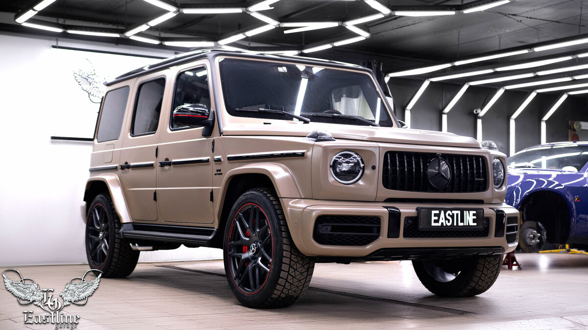 Многие из нас привыкли, что если Гелендваген, то обязательно чёрный, ну в крайнем случае, белый или серебристый. Естественно, Гелики бывают и фиолетовые, и синие, и красные и вообще всех цветов радуги и не только, и владелец посетившего Eastline Garage G63 AMG тоже решил выделиться из толпы своим не совсем обычным цветом. Mercedes-Benz G63 AMG, о котором речь пойдёт далее, сменил свой заводской чёрный на крайне необычный для Гелика бежево-песочный. Чтобы не трогать заводское лакокрасочное покрытие, а сама замена цвета произошла как можно быстрее, для изменения цвета кузова авто была выполнена его оклейка в виниловую пленку. Более того, на этом G63 AMG был произведен полный антихром кузова, чтобы подчеркнуть его стиль в том числе были окрашены пороги в черный мат. Виниловые пленки очень широко используются в мире автотюнинга, так как являются самым быстрым способом поменять цвет кузова авто. Оклейка автомобилей винилом всегда производится только на грамотно