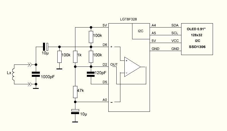 Схема измерителя индуктивности достаточно проста, она содержит несколько резисторов и конденсаторов, а так же плату микроконтроллера и OLED дисплей. 0,91″ I2C 128×32 OLED — это компактный дисплей, который использует технологию OLED (Organic Light Emitting Diode) для отображения изображений. Дисплей имеет интерфейс I2C, который обеспечивает простое подключение к микроконтроллерам и другим устройствам. Основные характеристики дисплея: — Разрешение 128×32 пикселей.