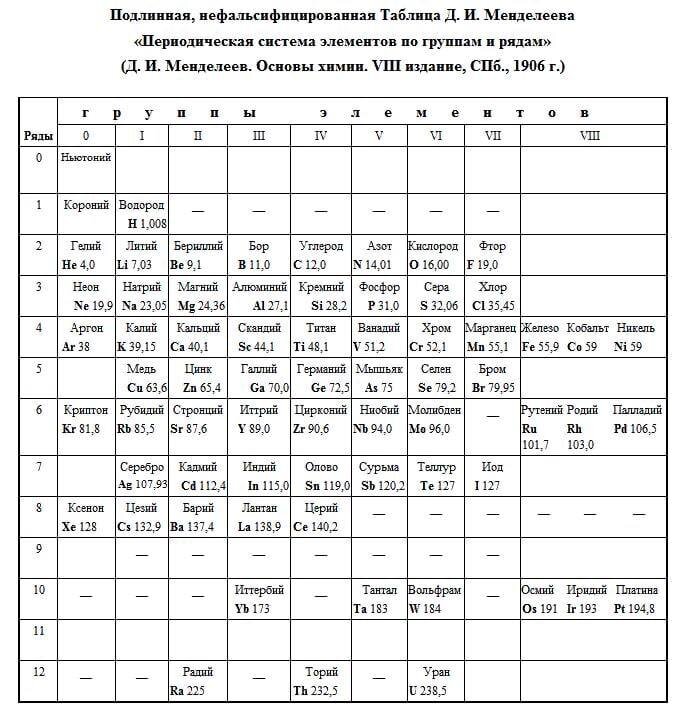 Изучая прошлое, выясняешь, что в нашем обществе корректировке подвергаются не только исторические свидетельства, но и открытия других дисциплин. Так, в частности, в свое время была подкорректирована таблица элементов, составленная Дмитрием Менделеевым. Последний раз в оригинальном виде она печаталась в 1906 году. От переноса нулевой группы вправо была уничтожена идея основы элементов : из таблицы исключили эфир. Вот как обосновывал данную группу сам Дмитрий Иванович: "Если аналоги аргона не дают соединений, их нельзя включать в группу ранее известных элементов и нужно открыть нулевую особую группу. Их положение в 0-группе составляет строго логическое следствие понимания периодического закона. ...Без сомнения, перед 1-ой группой существует 0-вая, представители которой имеют веса атомов меньше, чем у элементов 1-ой, невозможно отрицать существование элементов более лёгких, чем водород. "Короний", плотностью 0,2 от водорода, необходим, чтобы подобраться к наиглавнейшему, наиболее бы