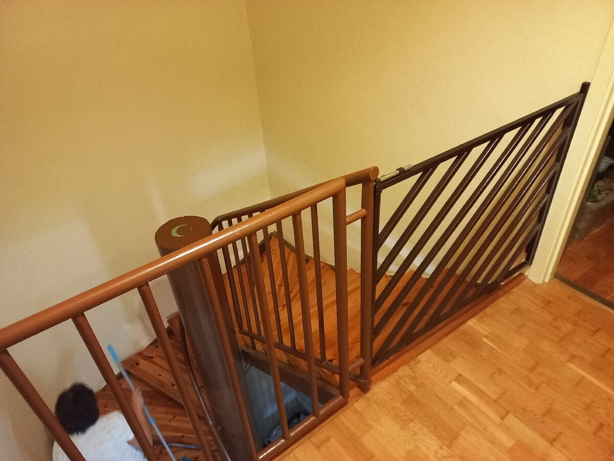 Детская безопасность в двухэтажном доме. Обратились хорошие люди с немного неожиданной просьбой... Дети маленькие, дом двухэтажный, лестницы крутые. Решили поставить калитку на втором и первом этаже на время пока не пройдет возраст - "пусть ползком, но везде залезу". Задача ясна - делаем. Использована профтруба 20 *20, расстояние между поперечинами такое, чтобы любознательное дитё не пролезло. По той же причине, шпингалет вынесен на самый верх. В стойке перил просверлено отверстие, куда шпингалет и входит. То есть, не надо приваривать никаких петель, проушин и прочего лишнего. В открытом положении, почти как элемент дизайнерской инсталляции. Для предотвращения самопроизвольного открывания - на стене магнит. Вот такая разная детская безопасность. Надеемся, кому то пригодится)