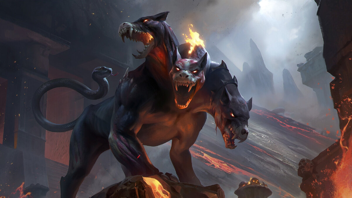 В древнегреческой мифологии огромный трёхглавый пёс, который был воплощением ужаса для любого смертного. Древние греки описывали этого монстра едва ли не с упоением – его облик был жутким и пугающим. Этот демонический сторож всегда находился на входе в подземное царство. Цербер (или Кербер, как указывается в некоторых преданиях) был чудовищным псом, что охранял вход в потусторонний мир. В своей «Теогонии» Гесиод говорит, что родителями жуткой собаки были Тифон и Ехидна. Хочу заметить, что оба этих существа красотой не отличались, и рождение дитя жуткого вида было вполне предсказуемо. Внешний облик пса из царства Аида внушал ужас всякому, кто видел его. В разных источниках указывается, что у монстра было две, три или более голов (тот же Гесиод указывает, что пёс имел 50 голов). На древних изображениях можно увидеть и другие жуткие детали внешности. Например, хвост Цербера представлял из себя ядовитую змею, на некоторых фресках змеи видны на спине и голове пса. НА СЛУЖБЕ В ЦАРСТВЕ МЁРТ