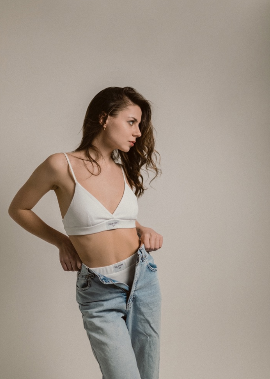 Попробовали с моделью такое сочетание: простой спортивный на идеальной фигуре.