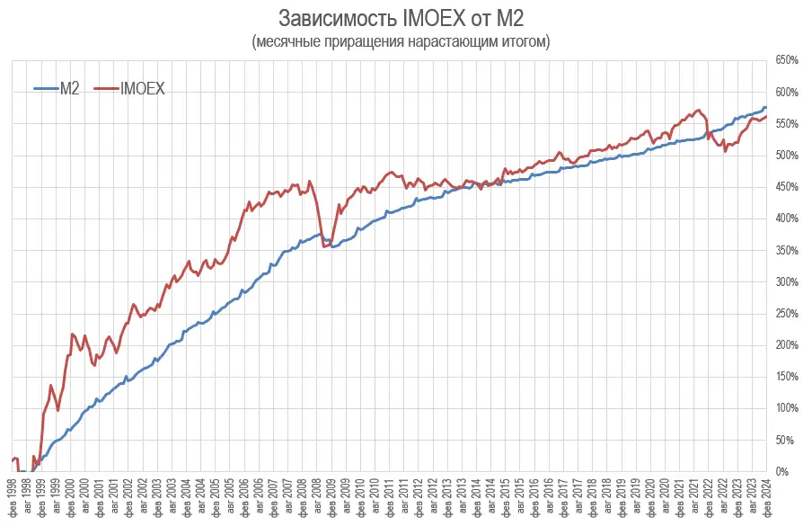 На акциях этот закон работает в полный рост - взгляните на многолетнюю связь рублевого индекса Мосбиржи (IMOEX) с рублевой массой (агрегата М2): Как на этом заработать?