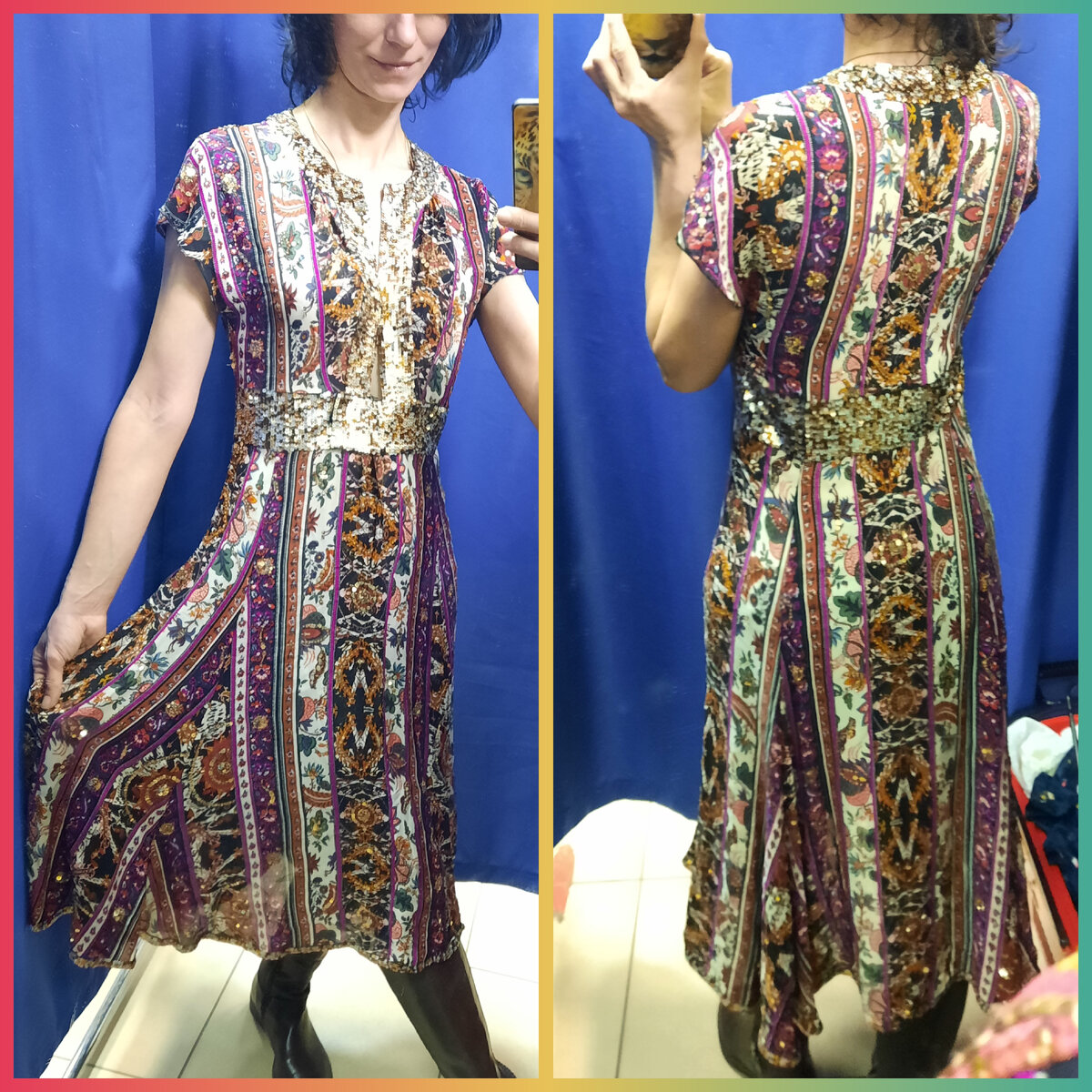 Желаю всем здравстврвать и пребывать в хорошем настроении!!! На связи Рязань. Иногда бывает, что так хочется принарядиться и сходить на какое-нибудь мероприятие, корпоративную вечеринку или на свидание. Покупать платье на один выход - это разорительство, я так думаю. Поэтому на помощь приходят модные магазины - секонд-хенды. Сегодня хочу показать подборку платьев! И начну обзор с самого яркого, это платье в восточном стиле из натурального шелка, расшитое бисером и пайетками от бренда "Diane vonFurstenberg". Марка была создана в 1975 году в Соединенных Штатах талантливым бельгийским дизайнером Дианой Симон Мишель Халфин. Все творения этой марки отличаются женственностью и чувственностью. Поклонницами этого модного дома стали знаменитости: Мадонна, Кейт Хадсон, Джессика Альба и многие другие. Пример цен на одежду этого бренда. Далее примерила платье-сарафан с приятным составом от бренда "KappAhl" Понравилось яркое платье из плотного хлопка, который держит фо