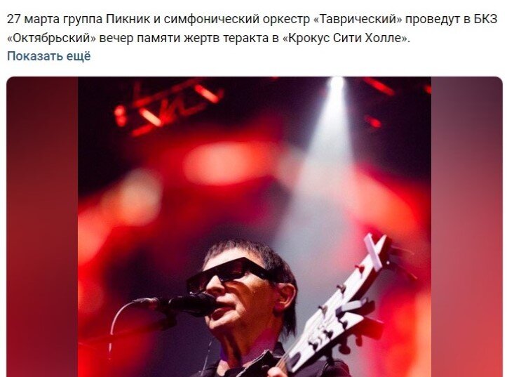 С неопределенностью вокруг выступления группы «Пикник» в Петербурге покончено: концерт состоится 27 марта в БКЗ «Октябрьский». Второе за день объявление об этом появилось вечером 25 марта на странице концертного зала ВКонтакте. В нем сказано, что музыканты «Пикника» будут выступать вместе с симфоническим оркестром «Таврический», и что это будет вечер памяти жертв теракта в подмосковном «Крокус Сити Холле». Организатором концерта выступил Фонд развития культуры «ЕВА». Все собранные средства будут направлены пострадавшим и семьям погибших в результате террористической атаки. Выступление «Пикника» в «Октябрьском» было запланировано на 27 марта еще до теракта. После того как московский концерт превратился в трагедию, петербургское мероприятие оказалось под вопросом. Сегодня утром администрация БКЗ сперва опубликовала пост о том, что концерт состоится, а чуть позже удалила его. После этого музыканты у себя ВКонтакте заявили, что «ищут возможность» провести в Петербурге вечер памяти погибших