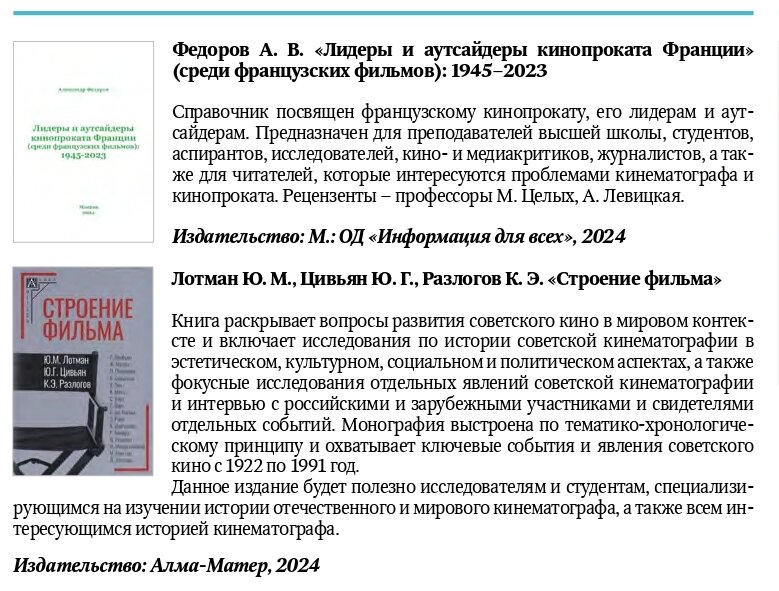 Федоров А. Лидеры и аутсайдеры кинопроката Франции (среди французских фильмов): 1945-2023. М.: Информация для всех, 2024.