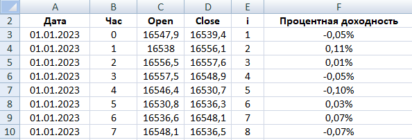 , где Close - цена в последний момент часа, Open - цена в первый момент часа, R% - процентная доходность.