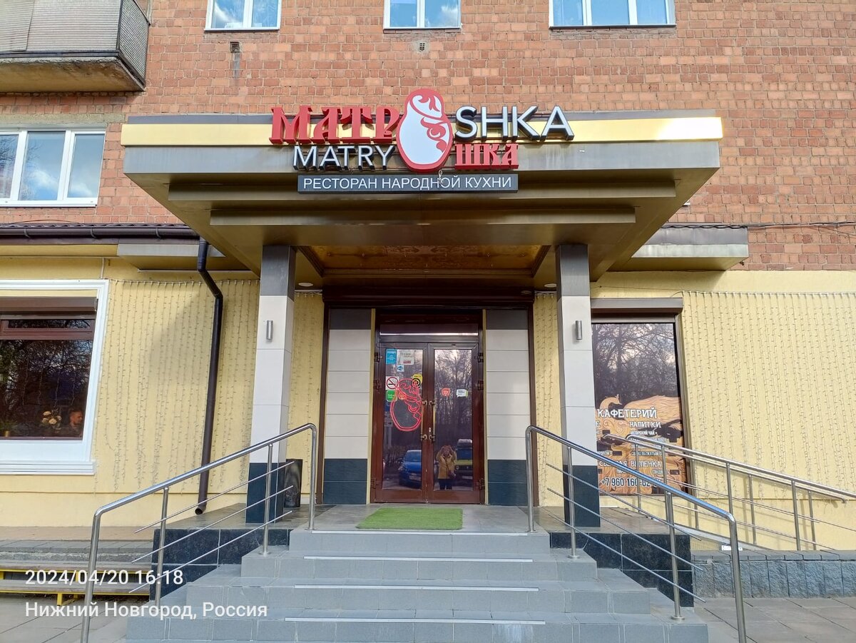 В Нижнем Новгороде на проспекте Гагарина , недалеко от торгового центра "Океанис " , где находится аквапарк , расположилось кафе Русской и Грузинской кухни Матрёшка. Так оформлен вход в кафе. В вестибюле стоит очень симпатичная матрёшка, просто огромных размеров. Зал кафе. Одна из стен стилизована под деревенскую избу. Деревянные рамы на потолке. Небольшая экспозиция украшений из хохломы и старинных вещей, тоже украшает стены этого заведения. Симпатичный самоварчик. Ещё немного хохломских изделий. В кафе так же есть детская комната , при мне кстати приходило несколько семейных пар с маленькими детьми. А теперь хочу рассказать что мы заказали в данном кафе на ужин . Борщ Нижегородский с малиной . Теплый салат . Филе судака. Форшмак и сет из пяти разных настоек . И один эклер на пробу . Все заказанные блюда мне в целом понравились, борщ был не много не обычен для меня , так как был без картофеля, я бы такой наверное назвал свекольник на вкус он был очень не плох. Теплый салат тоже б