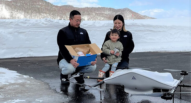 Компании Aeronext Co., Ltd., KDDI Smart Drone Co., Ltd. и Dentsu Hokkaido Co., Ltd. в начале марта провели в городе Синтоцукава тестирование доставки гуманитарной помощи с помощью дронов на случай катастрофы или стихийных бедствий. Доставка дронами в изолированные деревни с отрезанными дорогами является важной, например, доставка фармацевтических препаратов в районы, пострадавшие от землетрясения на полуострове Ното, и эта демонстрация позволяет создать новую интеллектуальную логистическую сеть в светлое время, чтобы помочь предотвратить последствия чрезвычайных ситуаций. В качестве груза доставлялись вещи, которые могут пригодиться во время катастрофы. Полеты уровня 3.5 предназначен для доставки дронами гуманитарной помощи и медикаментов. Полет в одну сторону был на расстояние примерно 13,4 км и длился около 35 минут. Синтоцукава расположен почти в центре между г. Саппоро и г. Асахикава. Снижение рождаемости и старение населения является серьезной проблемой для города. Мн