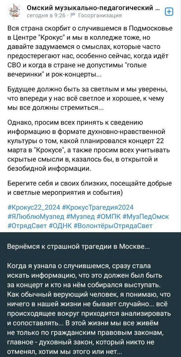 В официальном паблике Омского музыкально-педагогического колледжа накануне было опубликовано заявление о том, что произошедшее в «Крокусе» было неслучайным. В посте содержалось обвинение солиста группы «Пикник» Эдмунда Шклярского в сатанизме. «Вся страна скорбит о случившемся в Подмосковье в центре «Крокус», и мы в колледже тоже, но давайте задумаемся о смыслах, которые часто предостерегают нас, особенно сейчас, когда идет СВО и когда в стране недопустимы «голые вечеринки» и рок-концерты. Будущее должно быть светлым, и мы уверены, что впереди у нас все светлое и хорошее, к чему мы все должны стремиться... Однако просим всех принять к сведению информацию в формате духовно-нравственной культуры о том, какой планировался концерт 22 марта в «Крокусе», а также просим всех учитывать скрытые мысли в, казалось бы, открытой и безобидной информации. Берегите себя и своих близких, посещайте добрые и светлые мероприятия и события», - говорится в посте. Далее автор сообщения опубликовал фото солист