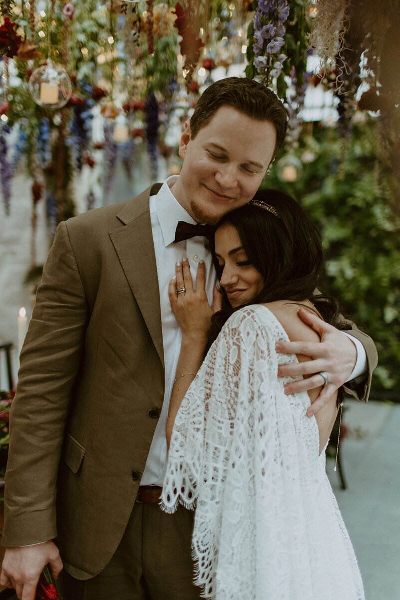 Когда она и ее нынешний муж начали процесс планирования свадьбы, список приглашенных должен был включать около 200 человек. Изучив варианты проведения свадьбы в небольшом саду ребята поняли, что в их плане что-то не так. Они остановились на новом подходе: задействовать бюджет, выделенный на большую свадьбу, и вместо этого устроить удивительную камерную свадьбу для 21 самых близких, друзей и знакомых. Невеста хотела, чтобы день ее свадьбы был "неземным". Их интимное торжество стало захватывающей воображение цветочной фантазией в стиле бохо. Декораторы и флористы позаботились о том, чтобы все помещение было усыпано цветами. Мерцали свечи. Был и плавающий свадебный торт. День этой пары- это напоминание всем, кто находится в процессе планирования собственной свадьбы: Передумать по ходу дела - это нормально, и иногда, когда вы меняете свой план, в итоге получается что-то незабываемо волшебное ✨. Давайте посмотрим на великолепные фотографии. Невеста придерживалась классического стиля в аксес