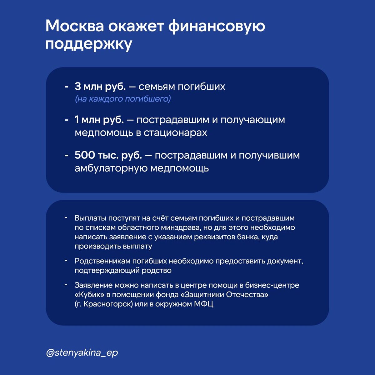 В рамках рубрики #соцвыплаты расскажу о финансовой поддержке, которую могут получить пострадавшие в результате теракта в Crocus City Hall, а также их семьи. Будут назначены в проактивном режиме (то есть обращаться в СФР с заявлением не нужно): 📌 пособия по временной нетрудоспособности; 📌 пенсии по случаю потери кормильца; 📌 пенсии по инвалидности; 📌 выплаты в связи с несчастным случаем на производстве тем, кто в момент теракта исполнял трудовые обязанности. По словам вице-премьера Татьяны Голиковой, уже назначено 22 пенсии по потере кормильца. Также напоминаю, что Соцфонд запустил горячую линию по вопросам выплат пострадавшим и семьям погибших при теракте. Позвонить можно в любое время. О других мерах поддержки — на карточках.