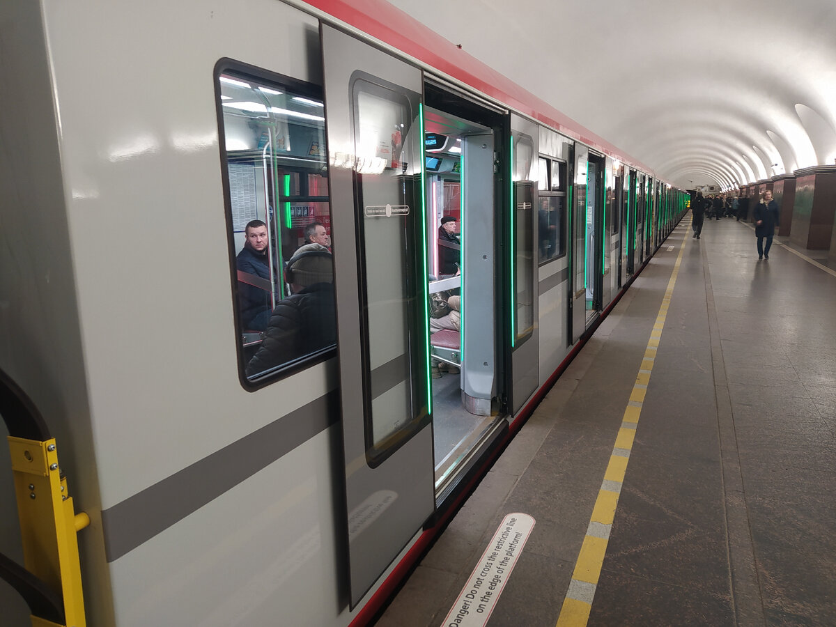 Впервые проехался на красной ветке на новом поезде "Балтиец". Был приятно удивлен низким уровнем шума в салоне. Такие тихие вагоны я раньше встречал только в Москве и в европейских подземках - в Париже, Копенгагене или Хельсинки. Оказывается, в одном углу вагона даже сделали разъемы для usb. Правда, до них было не добраться, так как именно в этом месте зачем-то сделали стоячие места, и перед розетками стояли люди. Ещё из прикольного - табло над дверьми, где можно посмотреть, к какой станции подъезжаем. Это удобно для глухих и слабослышащих. В интернетах пишут, что этот поезд - вариация модели "Москва". Вот только в отличие от московской модели, в Балтийце нет сквозного прохода, и это жаль. В Москве удобно, что можно перейти в другой вагон, где посвободнее, не дожидаясь следующей остановки, и не выбегая из вагона. В целом, поезд приятный. Жаль только, что таких, как пишет Википедия, ходит всего два, и только на красной ветке. Возможно, лет через 50 такое поезда будут ходить на всех вет