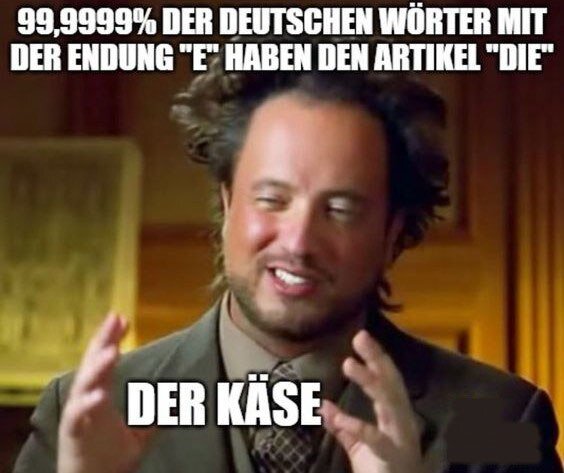 Hallo, Leute! Wie geht's? Сегодня мы с вами посмотрим на мемы и попробуем из них извлечь не только пару улыбок, но и немного новых знаний. Готовы? Los geht's! Переведем дословно? 99,999999% немецких слов, заканчивающихся на -e, будут женского рода. Тем временем "сыр" - der Käse. Ну, согласитесь, рода немецких слов - это же истинная боль. Права, с сыром проще - у нас ведь сыр тоже "он". Увы, не только сыр выбивается из правила окончания -e. Вот еще несколько довольно распространенных в речи примеров таких существительных. Здесь будет чуточку сложнее. Опишите немецкий язык.
