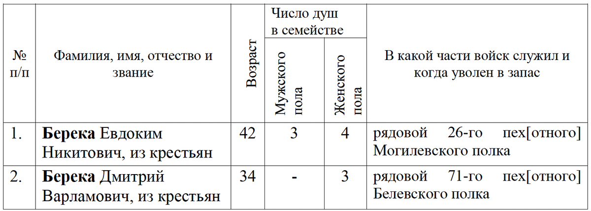 Ниже привожу список запасных нижних чинов, проживавших в с. Дмитриевка Никольск-Уссурийского уезда Черниговской волости на 1900 г. с указанием ФИО и возраста главы семьи, количества душ мужского и женского пола, звания. Источники: