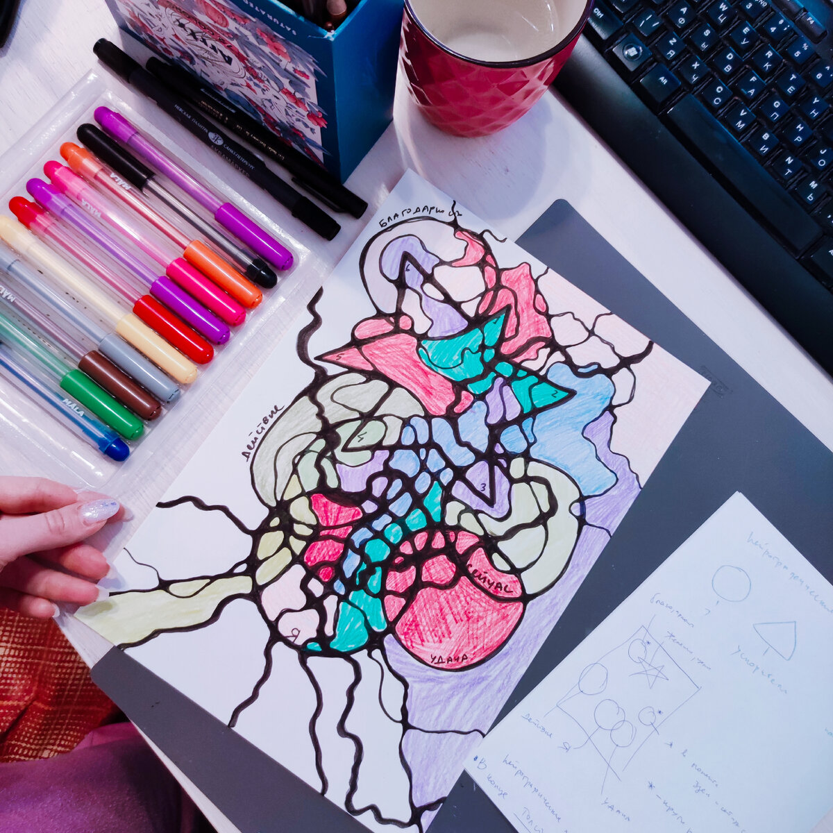 Открыли нейрографику в 2014 году, так что она ещё молода как наука или как метод. Весь мастер-класс рассказывали, что эта техника заменяет походы к психологу, мол сам с собой всё прорабатываешь. Мозг перепрограммирует сам себя, видит скруглённые углы и считает, что всё отлично.