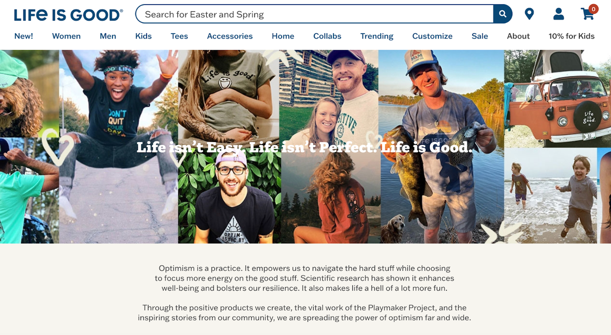 Бренд Life is Good — это не просто распространение оптимизма, хотя, благодаря таким бодрящим слоганам на футболках, как «Seas The Day» и «Forecast: Mostly Sunny», трудно не улыбнуться. В мире существует множество компаний, производящих футболки, но Life is Good выделяется среди них своей миссией, которая выходит за рамки забавной одежды: распространять силу оптимизма. Эта миссия может показаться неожиданной, если вы не знакомы с общественной благотворительностью компании: как компания, производящая футболки, поможет распространить оптимизм? Life is Good отвечает на этот вопрос ниже по тексту, где миссия объясняется более подробно с помощью видеоролика и ссылок на сообщество компании и страницу проекта Life is Good Playmaker.